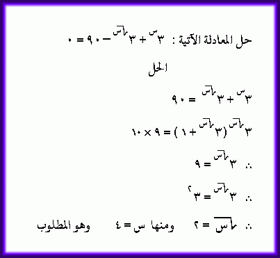 http://latex.codecogs.com/gif.latex?...3^{4}+3^{2}=90 وكذلك بفرض أن http://latex.codecogs.com/gif.latex?\dpi{120} x< 4 http://latex.codecogs.com/gif.latex?...3^{4}+3^{2}=90 إذن لا توجد قيمة أخري غير س=4 هي التي تحقق المعادلة. http://latex.codecogs.com/gif.latex?...\therefore x=4 وهو المطلوب إيجاده |