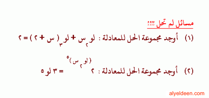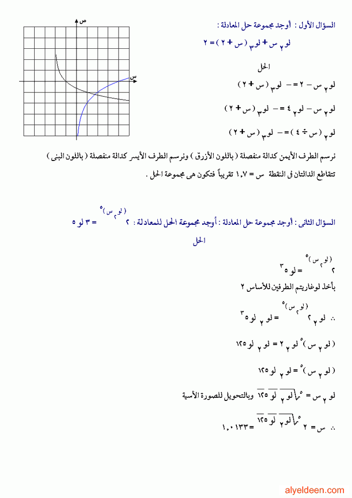 الاولى لو(س\4)للاساس2---- الثانيه لو(س+2) للاساس3 ويكون الحل 1,7 المسأله الثانيه-----------------تحل بأخذاللوغاريتم للطرفين للأساس 2 ثم بأخذالجذر الخامس للطرفين ثم بتحويل المعادله من الصوره اللوغاريتميه الىالصوره الاسيه لحساب قيمة س=2,02 تقريبا |