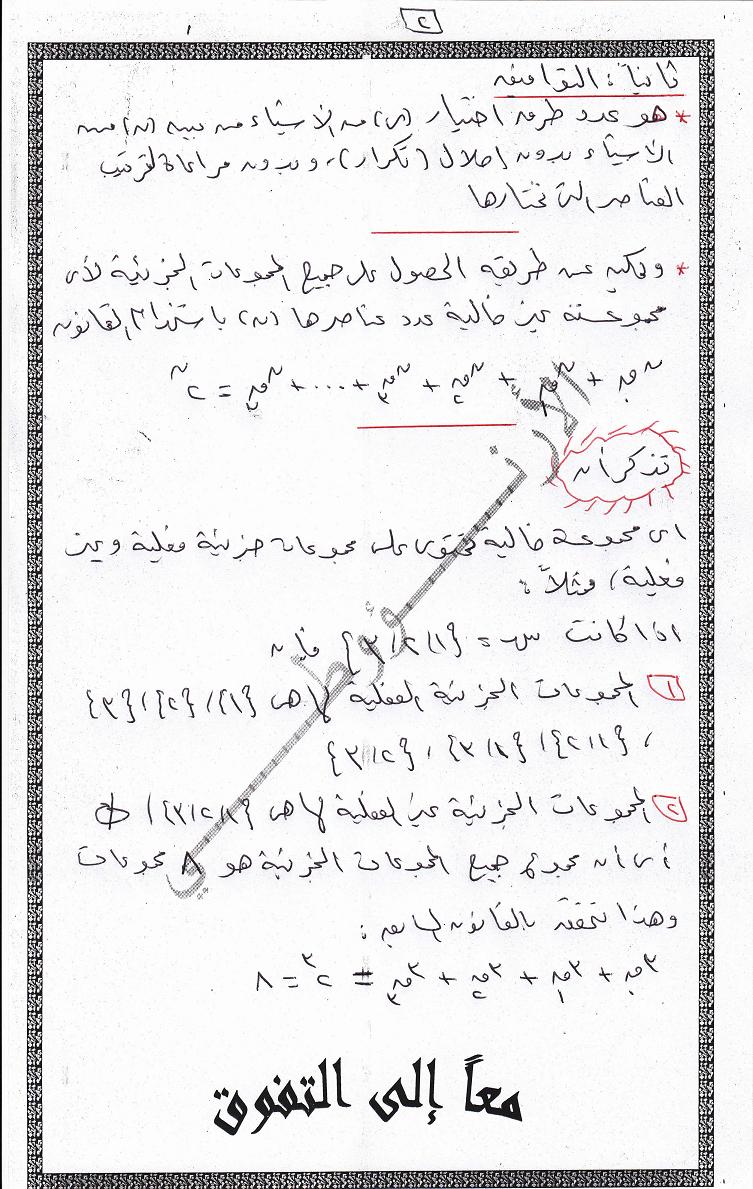 هذه هي المرة الأولي التي أقدم فيها مراجعت لدروس الرياضيات للمرحلة الثانية من الثانوية العامة في هذا المنتدي، وقد راعيت في تلك المراجعات التبسيط بقدر الإمكان وتجنب الإثباتات والتوضيحات التي من الممكن أن يستغني عنها الطالب أثناء المراجعة لأنها في النهاية مراجعة فقط كما هو واضح من العنوان وليس شرحاً تفصيلياً، وبالطبع فهي لن تفيد الطالب الذي ليس لديه أي فكرة عن المنهج، لذا ننصحكم بأن تستذكروا تلك الدروس جيداً قبل اللجوء إلي تلك المراجعات حتي تأتي تلك المراجعات بأفضل ثمارها... كما راعيت في تلك المراجعة إدراج القوانين بصورة مبسطة دون إسهاب أو تفصيل، وأعدكم أن ما سوف أعده من تلك المراجعات لن يخرج عنه الامتحان أبداً إن شاء الله.... وفي نهاية كل باب رأيت أن أضع عدة تمارين ومسائل متدرجة للطالب يقوم بحلها بنفسه، فإن تعثرت عليه بعض المسائل فليسألني لأرشده إلي حلها أو أقوم بحلها كاملة، هذا وأرجو أن يعلم الطالب أنني أرحب بأي أسئلة في أي باب من أبواب الرياضيات فليتفضل بطرحها دون غضاضة أو تردد.... والآن سوف أقدم مراجعاتي علي باب التباديل والتوافيق والله تعالي يهدينا ويوفقنا إلي ما يحبه ويرضاه تحياتي لكم |