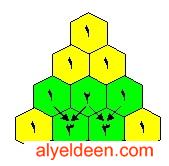 ثالثاً اللون الأخضر : الأعداد المخمسة وهى عدد قطع النقود التى يمكن وضعها على هيئة أضلاع مخمس منتظم وهى تبدأ من العدد 1 2 + 3 = 5 ( مخمس موزع على رؤوسه القطع ) 3 + 4 + 5 = 12 ( مخمس كل ضلع منه فوقه قطعتين ) 4 + 5 + 6 + 7 = 22 ( مخمس كل ضلع منه فوقه 3 قطع ) 5 + 6 + 7 + 8 + 9 = 35 ( مخمس كل ضلع منه فوقه 4 قطع ) 6 + 7 + 8 + 9 + 10 + 11 = 51 ( مخمس كل ضلع منه فوقه 5 قطع ) فى كل مرة نترك العدد الأول ونأخذ بقية الأعداد ونضيف عليها العددين التاليين لآخر عدد http://alyeldeen.com/up/do.php?imgf=...2979669971.jpg |