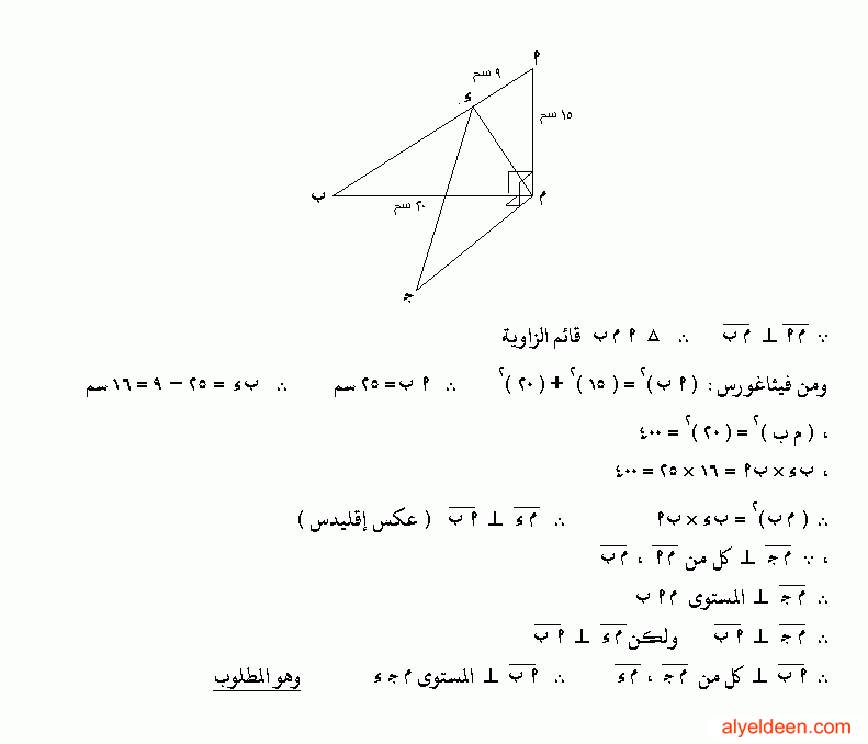 والمسألة بتقول م أ ,م ب,م ج, ثلاث مستقيمات متعامدة مثنى مثنى فاذا كان م أ=15سم,د تنتمى الى ب أ بحيث أد=9سم رسم م د . اثبت ان م دعمودى على أب (ثانيا) أب عمودى على المستوى م ج د وشكرا جزيلا لاهتمام حضرتك وبارك الله فيك |
